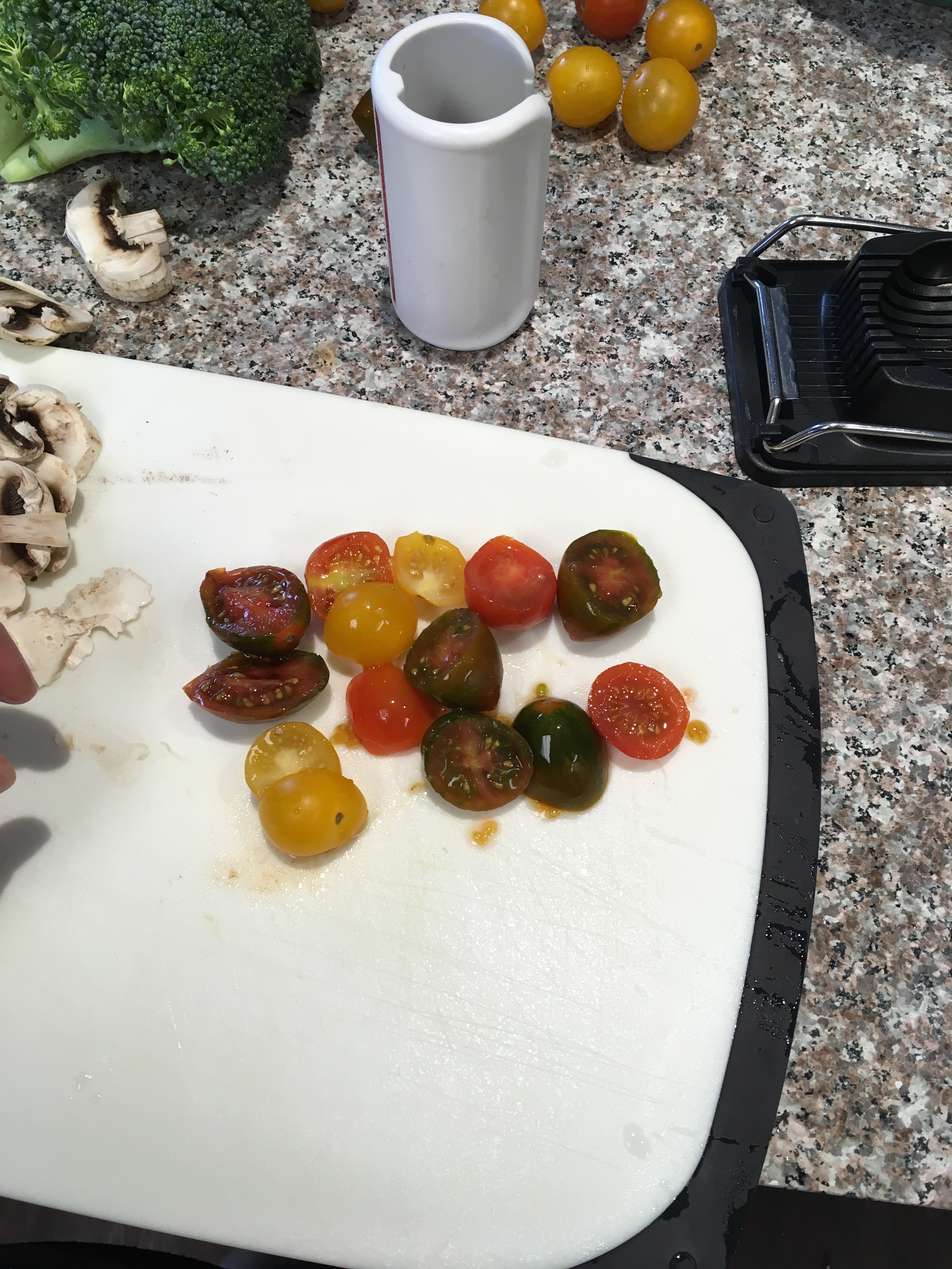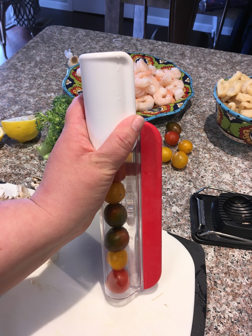 Pro-tip #2- Buy this tomato slicer pictured. I found this one on Zulily and makes the annoying job of slicing cherry or grape tomatoes actually FUN! Throw them in the tube and zip the handle down! The handle has a blade in it that slices ’em right up!