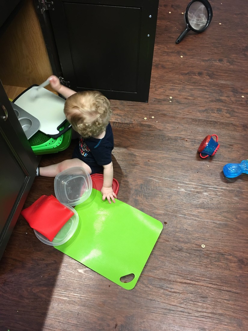 While mama was making pasta, Little Man thought it was the perfect opportunity to “reorganize” the cabinets and “decorate” the floor with Cheerios!