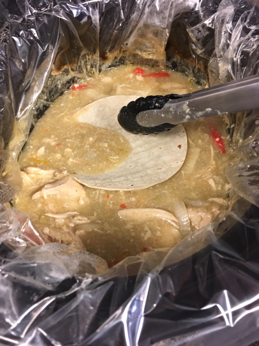 Once the chicken is cooked, it comes together really quickly! Tong (new verb) those corn tortillas and dip them into the crockpot liquid/chicken mixture. Corn tortillas are hard to work with. I’ve tried heating them before dipping them and it doesn’t matter- these puppies break🙄. Don’t get discouraged. Everyone knows they’re lame.