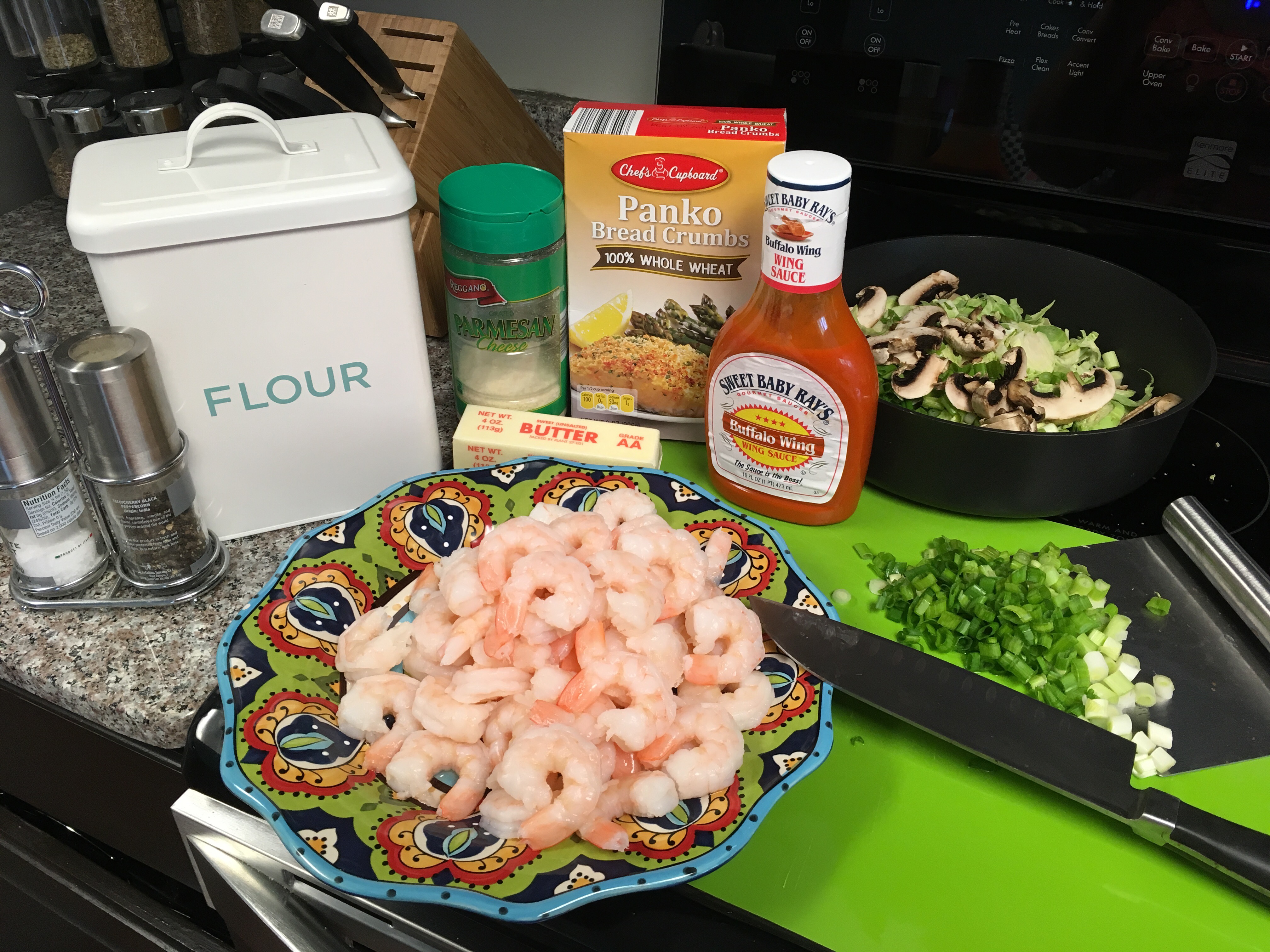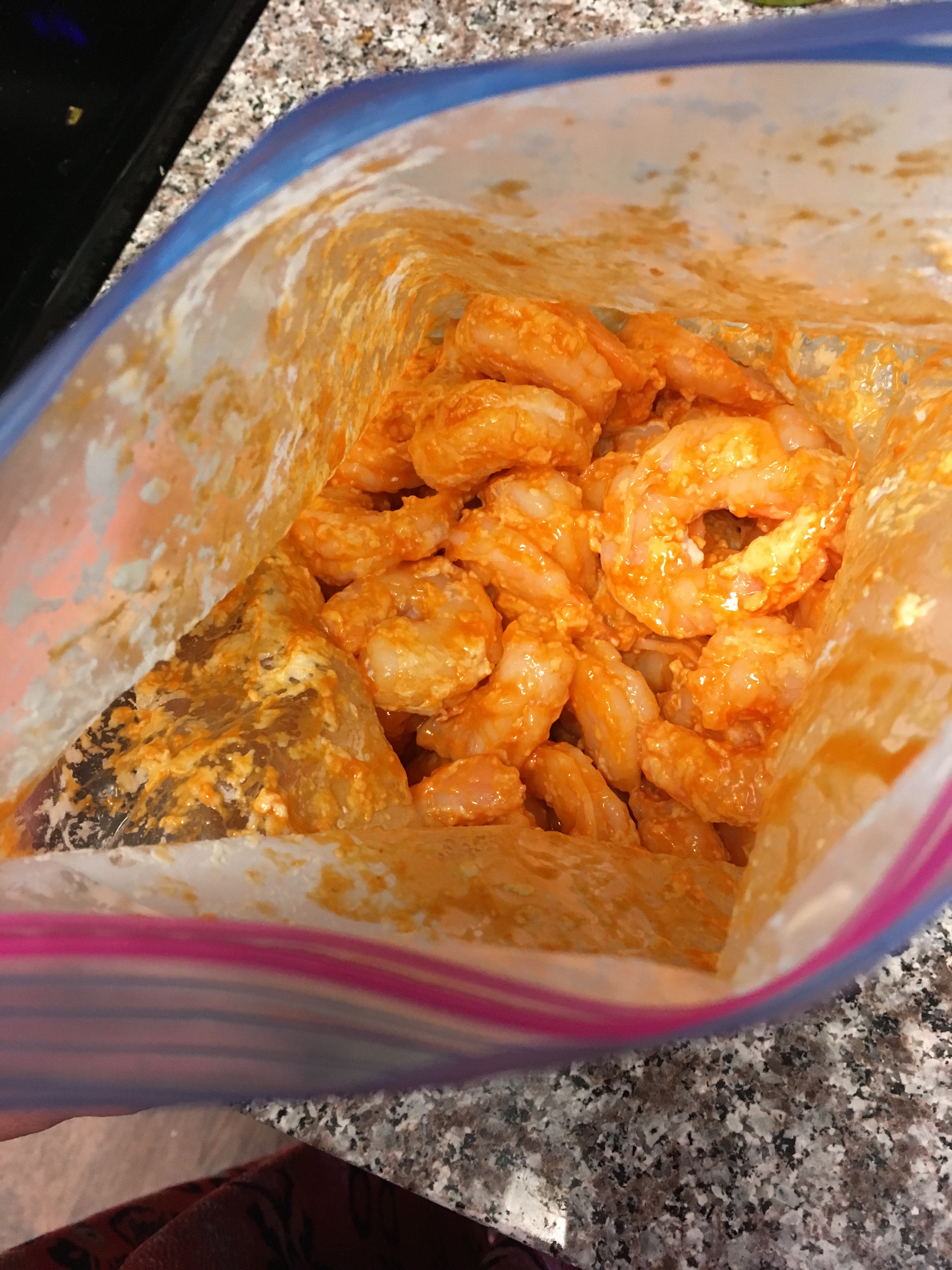 Next, add 1/4 cup of buffalo sauce to the bag of floured shrimp. “Shake. Shake. Shake, Senora!” til everything is coated again with that heavenly sauce. Put the bag in the fridge until it’s time to assemble.