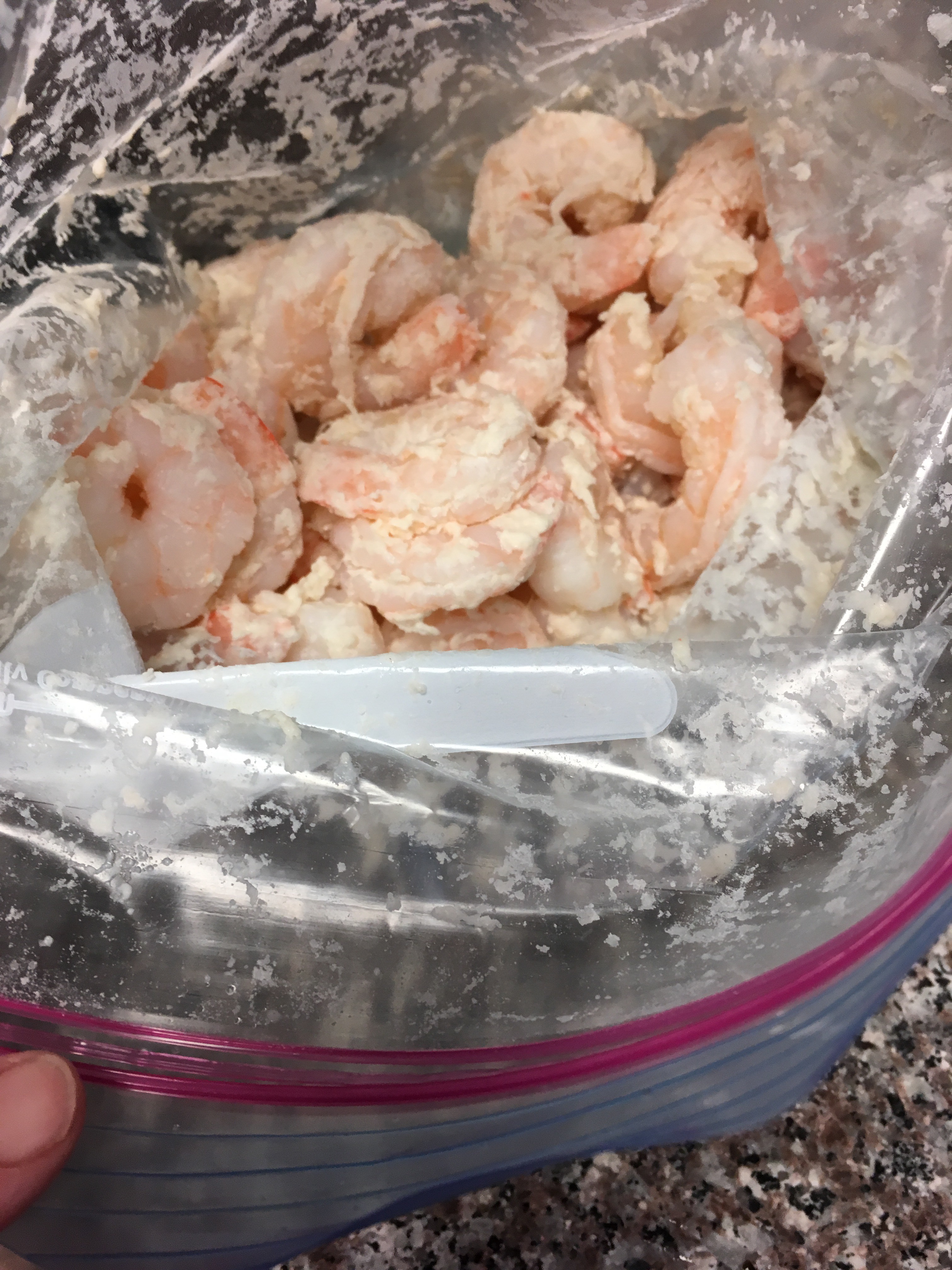 Take the 1/2 cup flour and put it and the shrimp into a ziplock bag. Squish it all around until the shrimp is coated with flour.