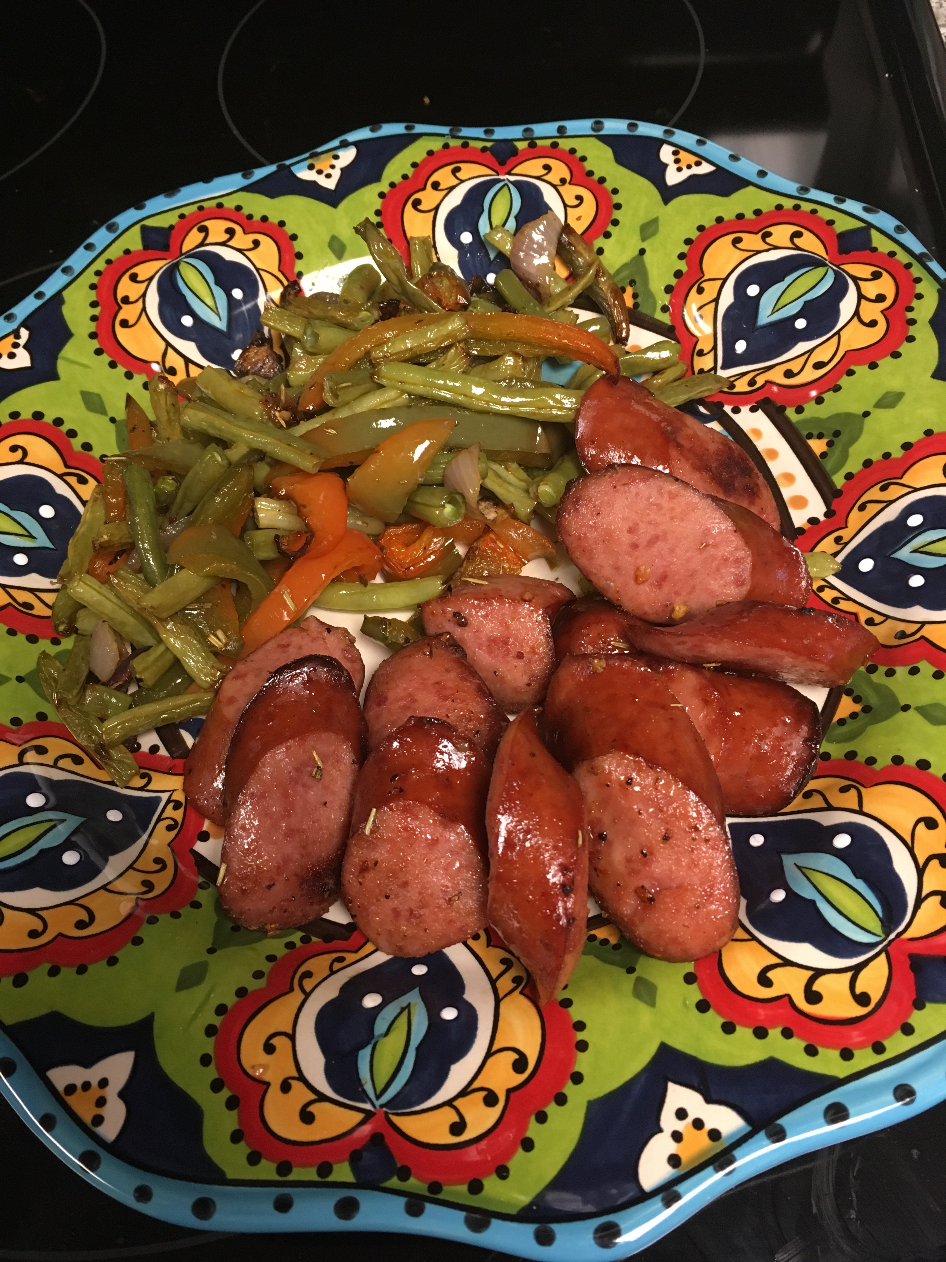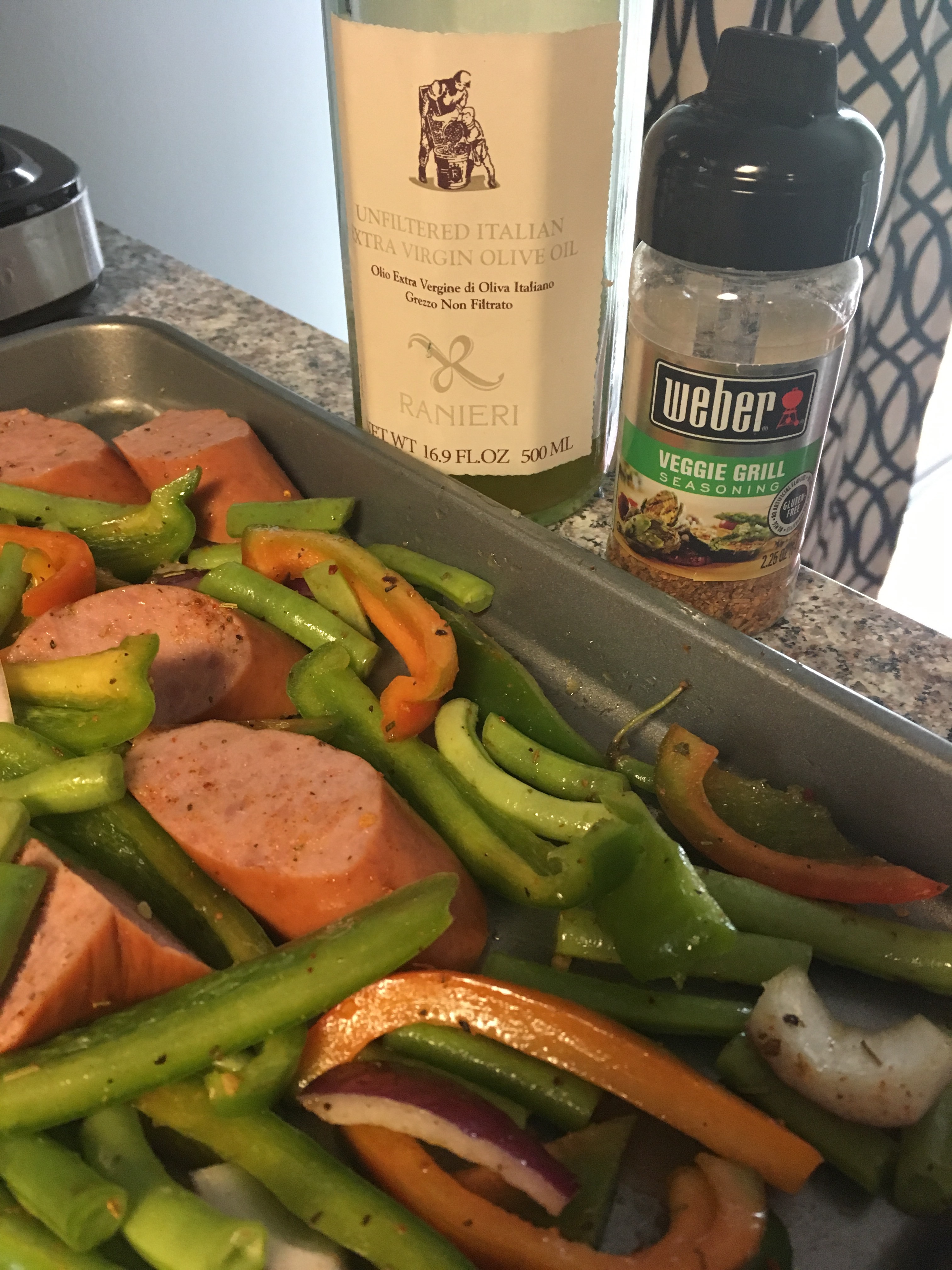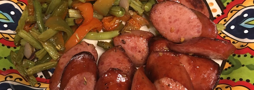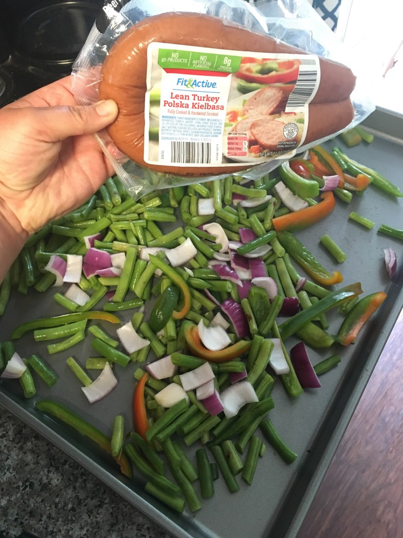 My homegirl, Vanessa, introduced me to the Aldi Fit and Active Turkey Kielbasa – yummy! Since these bad boys are already cooked, I wanted something to quickly warm them and get ’em all tasty. With a sheet pan meal, I was sure to make this happen …. and with the bonus of it being on the table and ready to injest/digest in 25 minutes!